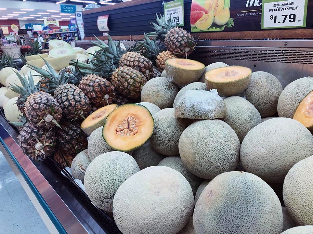 野菜や果物は日本と同じようなものも多いけど、こうやってパイナップルやメロンがゴロゴロと普通に並んでいるのは、南国っぽい。