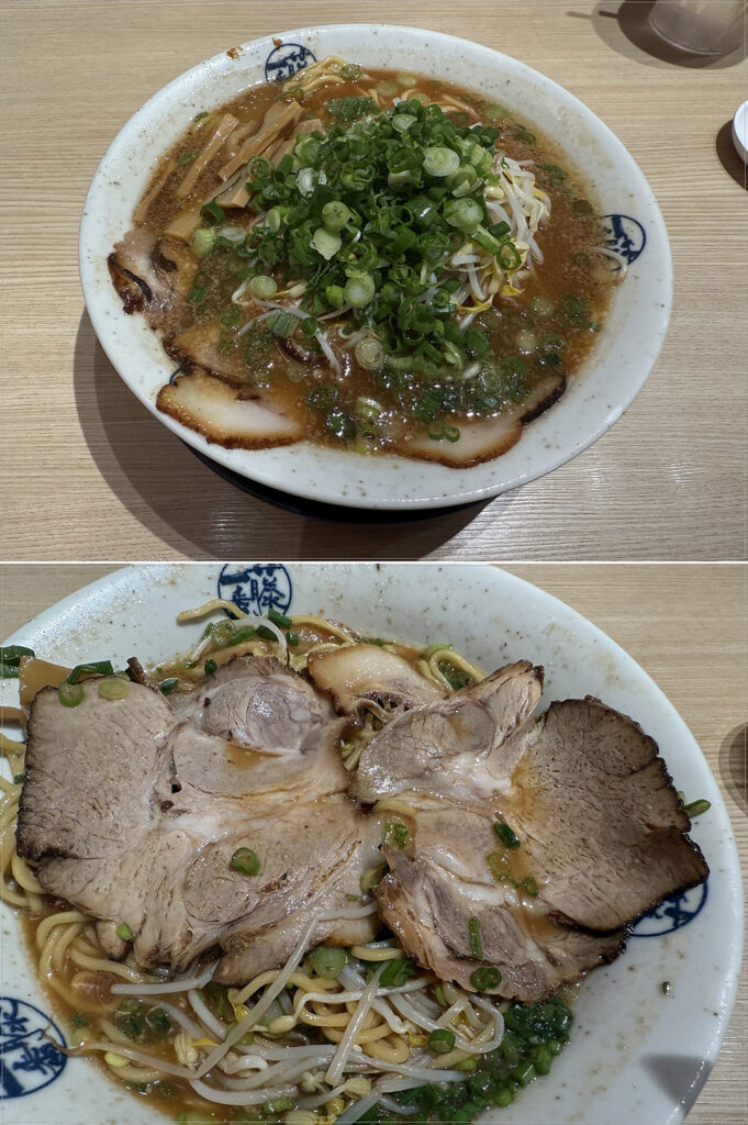 ネギともやしがトッピングされ、チャーシューは大きなものが2枚乗っています。