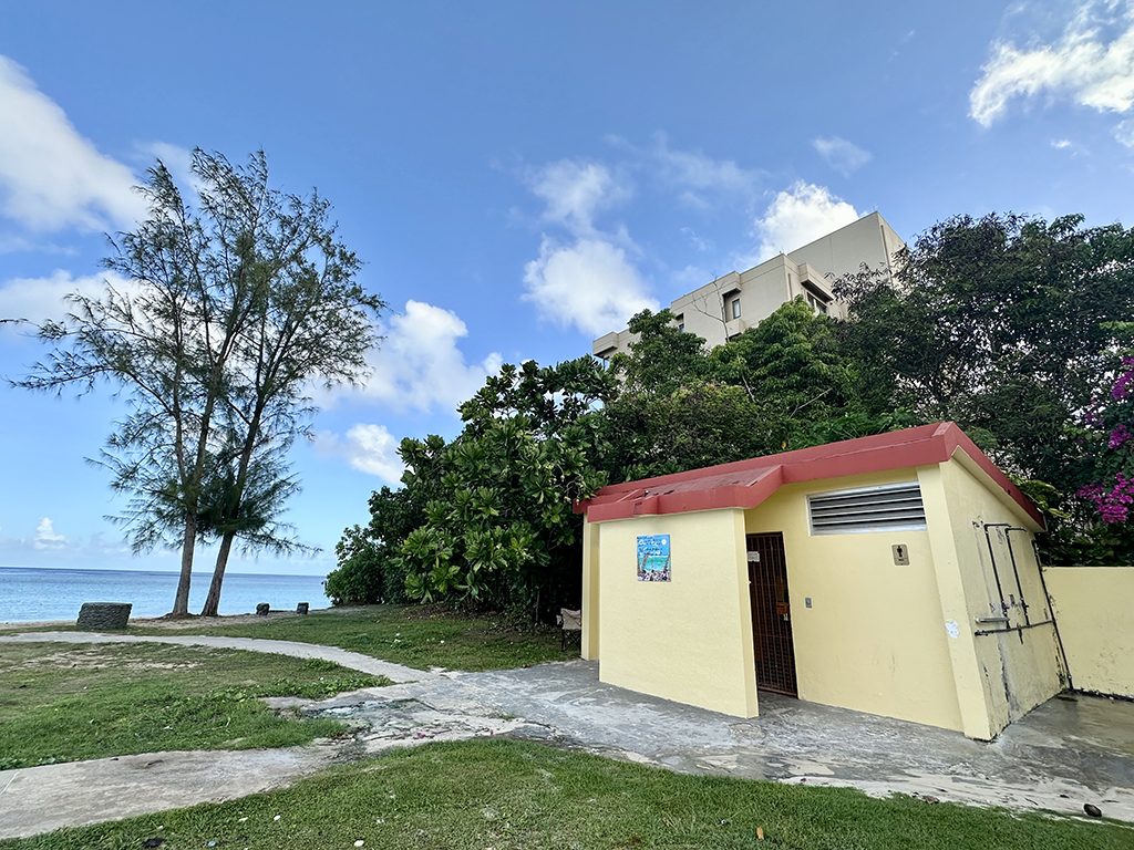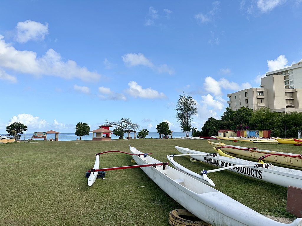 近年ではこの太平洋上の島々でアウトリガーカヌーレースが盛んに開催されており、グアムでも人気スポーツのひとつとなっています。ビーチに隣接する芝生エリアはアウトリガーカヌー置き場になっています。