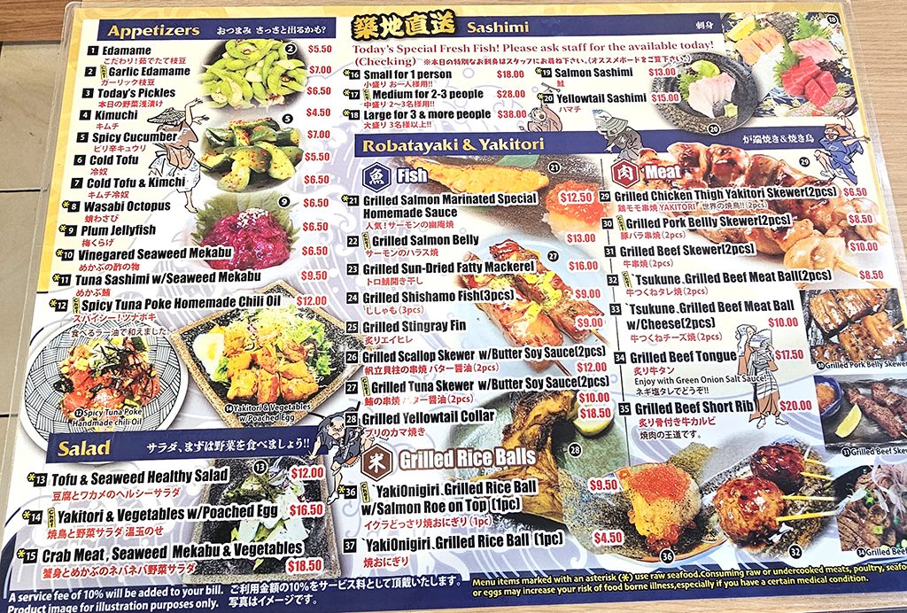 다양한 메뉴에 놀라실 거예요! 1번부터 37번까지만 봐도, 에다마메나 차가운 두부 같은 편안한 기본 메뉴부터 츠키지에서 직송되는 신선한 매일 바뀌는 사시미까지 모든 것이 준비되어 있습니다. 게다가, 향긋한 로바다야키 (화로 구이) 메뉴는 술과 완벽하게 어울리는 구운 간자미 지느러미나 기름진 방어의 풍미가 응축된 뽈살 구이 같은 메뉴를 제공합니다. 뜨겁고 육즙 가득한 소고기 쿠시카츠 (꼬치에 꿰어 튀긴 소고기), 녹진한 치즈와 소고기 츠쿠네 (미트볼) 구이, 그리고 향긋한 구운 주먹밥까지 정말 다양한 라인업을 즐기실 수 있습니다!