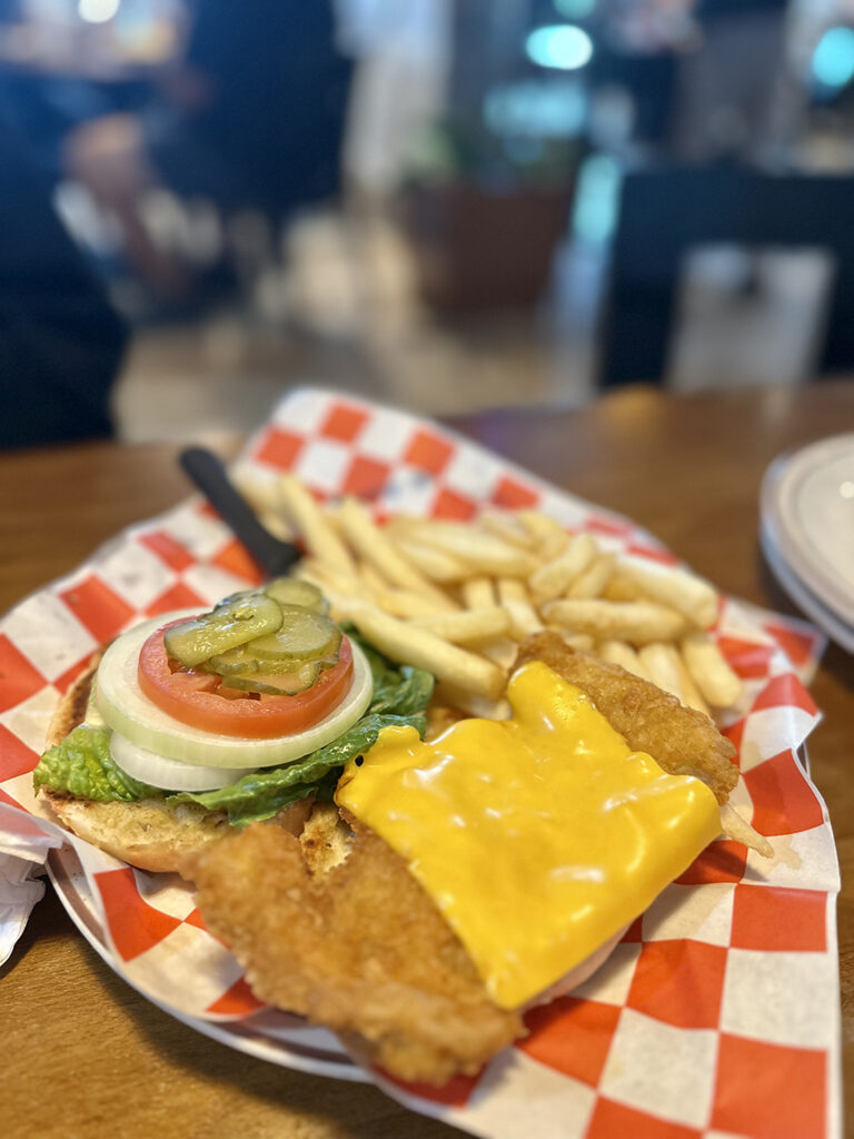 치킨 카츠 & 치즈버거(Chicken Katsu & Cheeseburger) 의 치킨은 빵에서 튀어나올 만큼 거대한 크기를 자랑합니다.