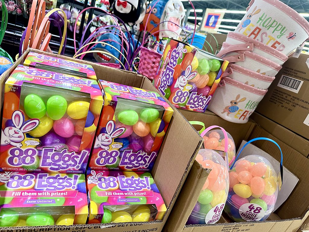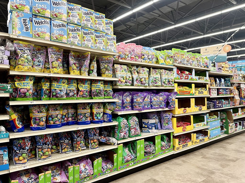 아이들에게 부활절 하면 빼놓을 수 없는 것이 바로 에그 헌트입니다. 숨겨진 달걀을 찾아 모으는 게임인데, 페이리스 슈퍼마켓(Payless Supermarket)에는 그를 위한 아이템들이 가득합니다. 이곳의 간식 코너도 봄 색으로 가득하며, 달걀 안에 넣을 수 있는 한 입 크기의 초콜릿이나 사탕이 들어 있는 대형 봉지가 판매되고 있습니다.