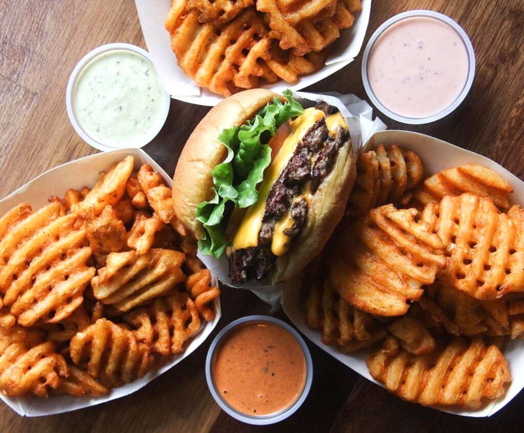 共販售五種漢堡,分別是經典漢堡(Classic)、經典雙人漢堡(Classic Double)、勁辣洋蔥堡(Jalapeno Onion)、墨西哥辣椒蜂蜜堡(Honey Chipotle)、小豬堡(Piggy Smalls ),皆是100%自製牛肉肉餅,風味獨特,各有擁護者。另外值得一提的是做成像華夫餅的waffle fries,提供三種不同風味的醬汁,豪邁淋上後畫面療癒,美味更是不在話下,很適合三五好友一起共享。