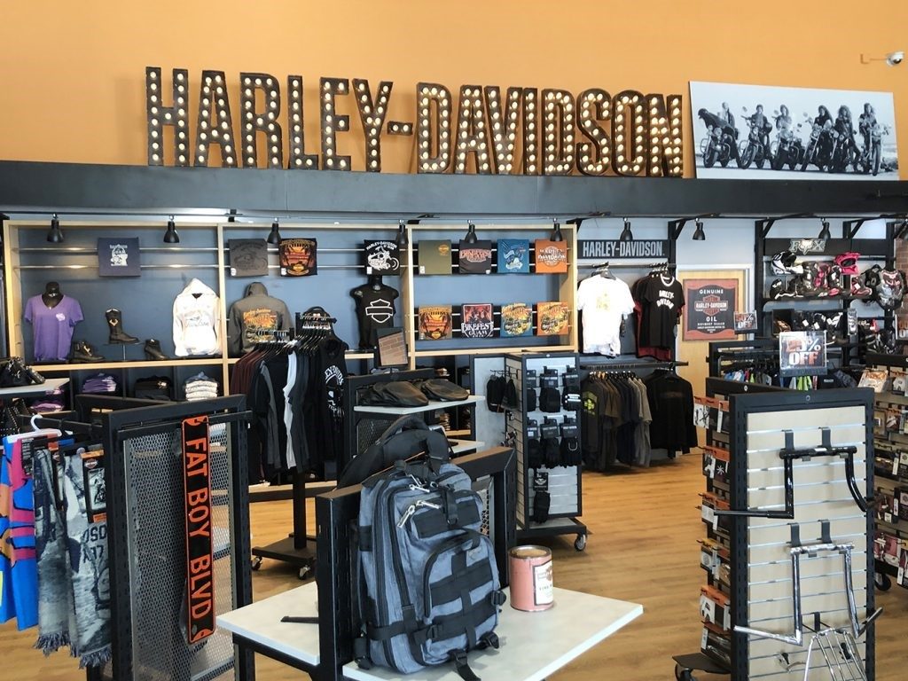各種繡有哈雷標誌的夾克、T卹、皮帶、手套、手鐲等琳瑯滿目,還有旅行用品、頭盔和鞋類,可說是應有盡有。
