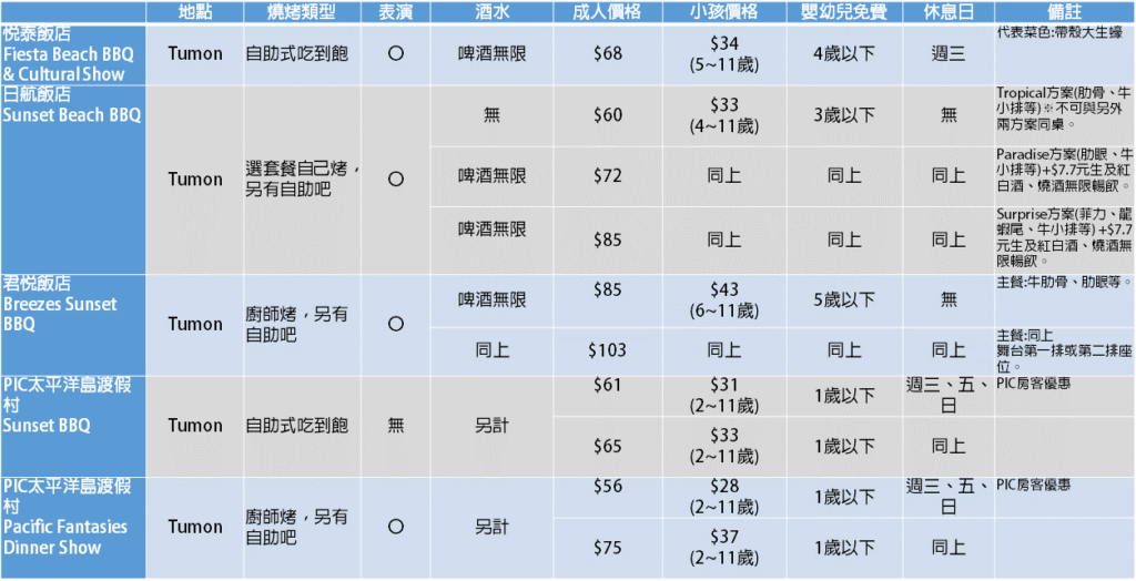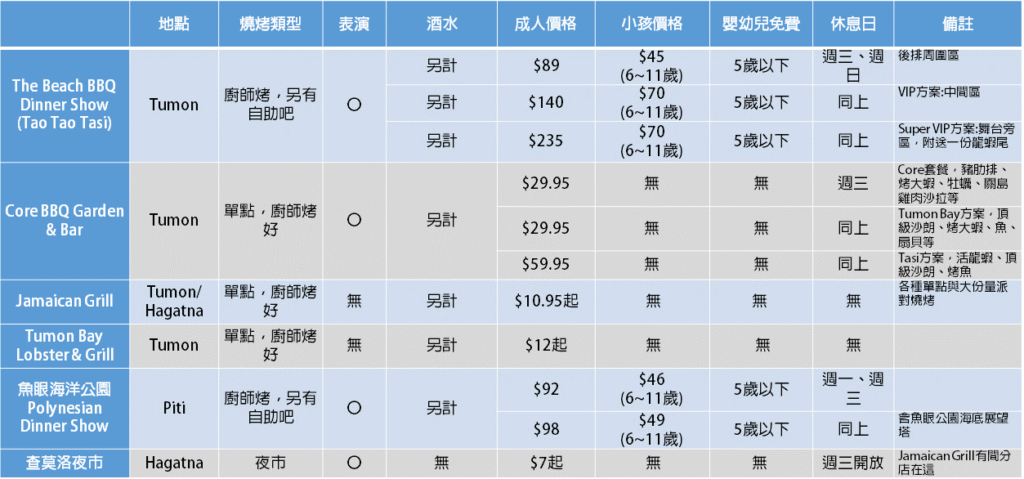 ※先比較出自己所想要的燒烤類型,就比較不會霧沙沙了,食材詳細資料因為常因店家更新而有所不同,本篇就不多加描述了,價格的話僅供參考,還是以店家實際更新狀況為主,但都建議出發前能夠先預約好,畢竟關島也是個度假天堂,有些餐廳可是非常搶手的,希望大家都能有趟愉快美妙的關島之旅喔。